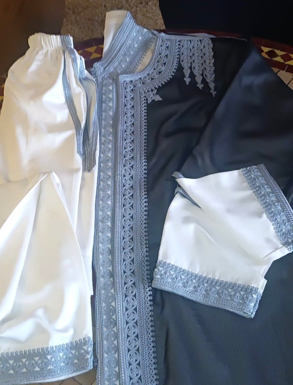 un très beau jabador marocain. un costume traditionnel trois pièces. Deux pièces pontalon et chemisier en tissu mlifa satinée avec des broderies marocaines en fil de soie et en fil d’argent. le gilet est en satin muslin trois quart aves des broderies qui couvrent toutes les bordures du gilet. un produit de grande qualité idéal pour les occasions et les rencontres familiales.