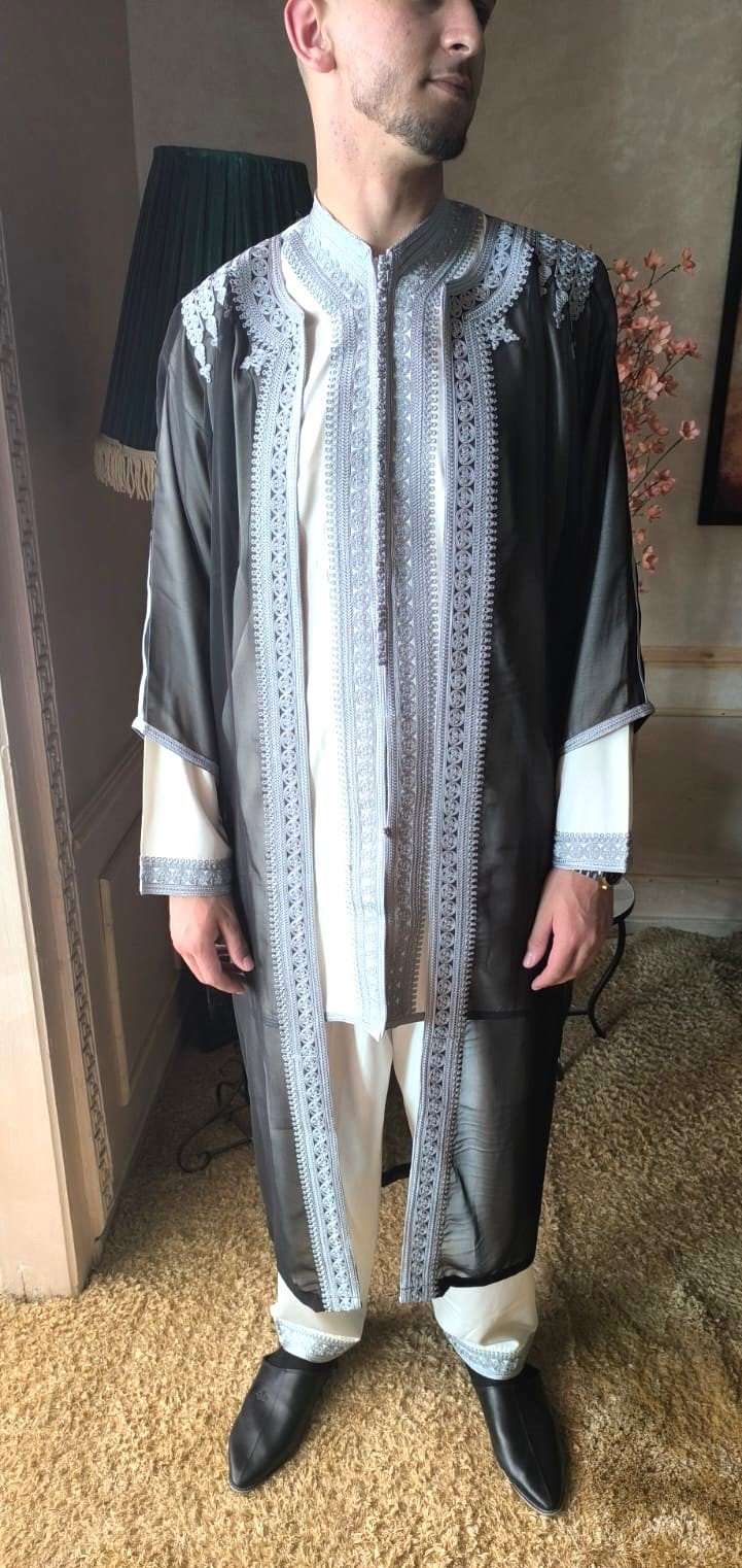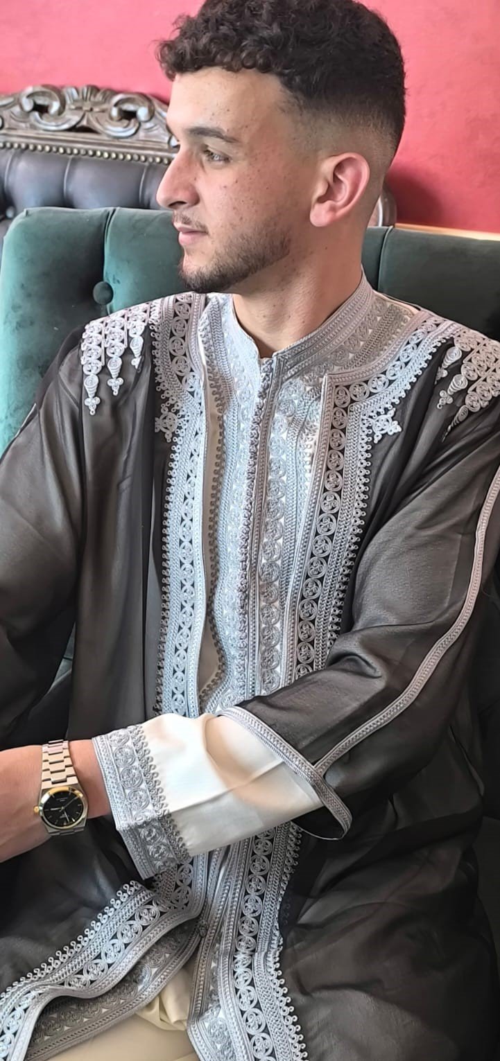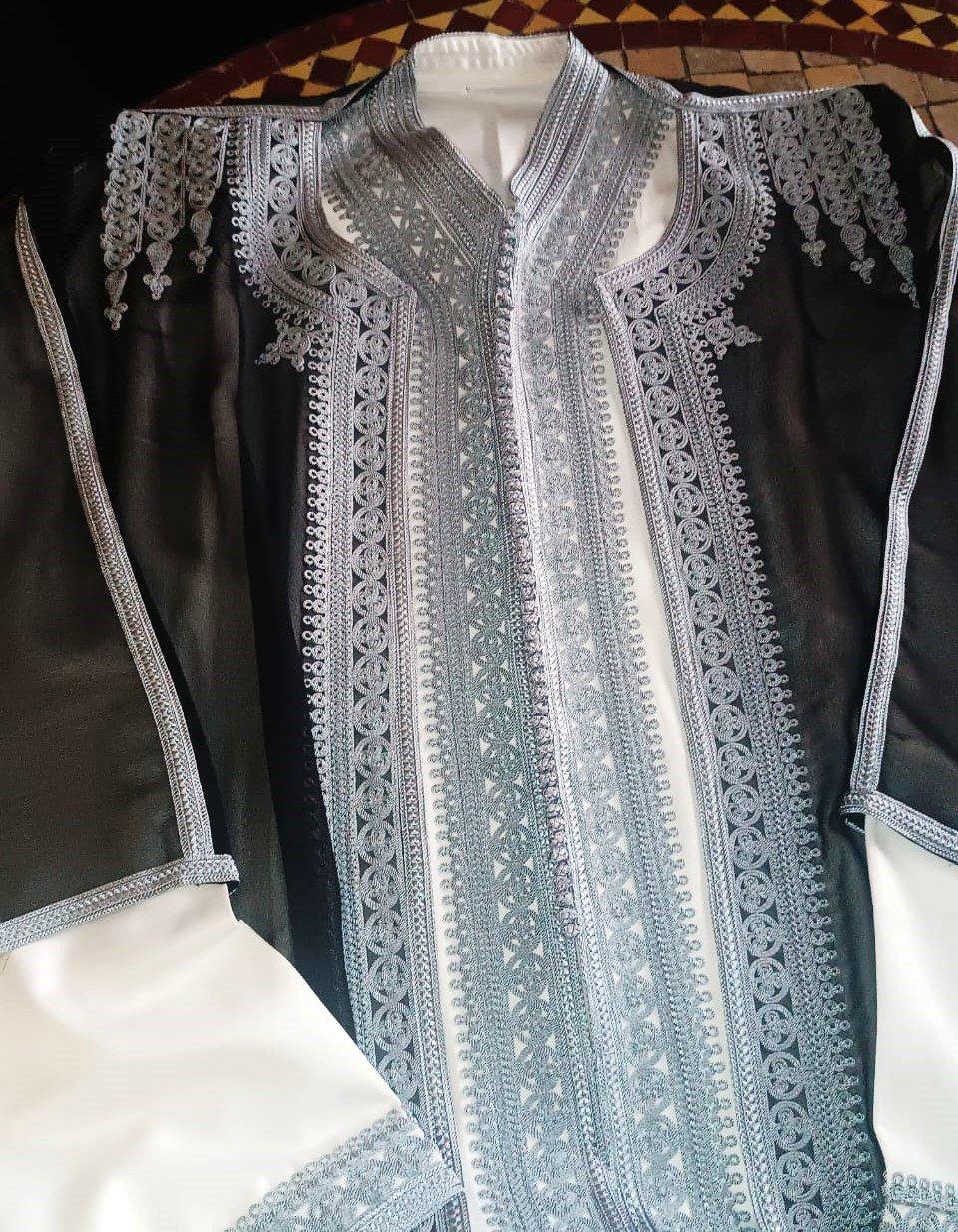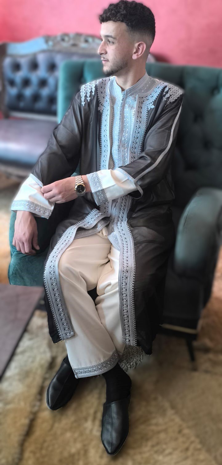 Le jabador est un très beau costume traditionnel marocain pour homme. Il est composé de trois pièces. Deux pièces le pantalon et le chemisier en tissu mlifa satiné et le haut gilet en tissu muslin transparent. Les bordures des trois pièces sont bordées en traditionnel marocain handmade ce qui donne un aspect élégant et prestigieux.