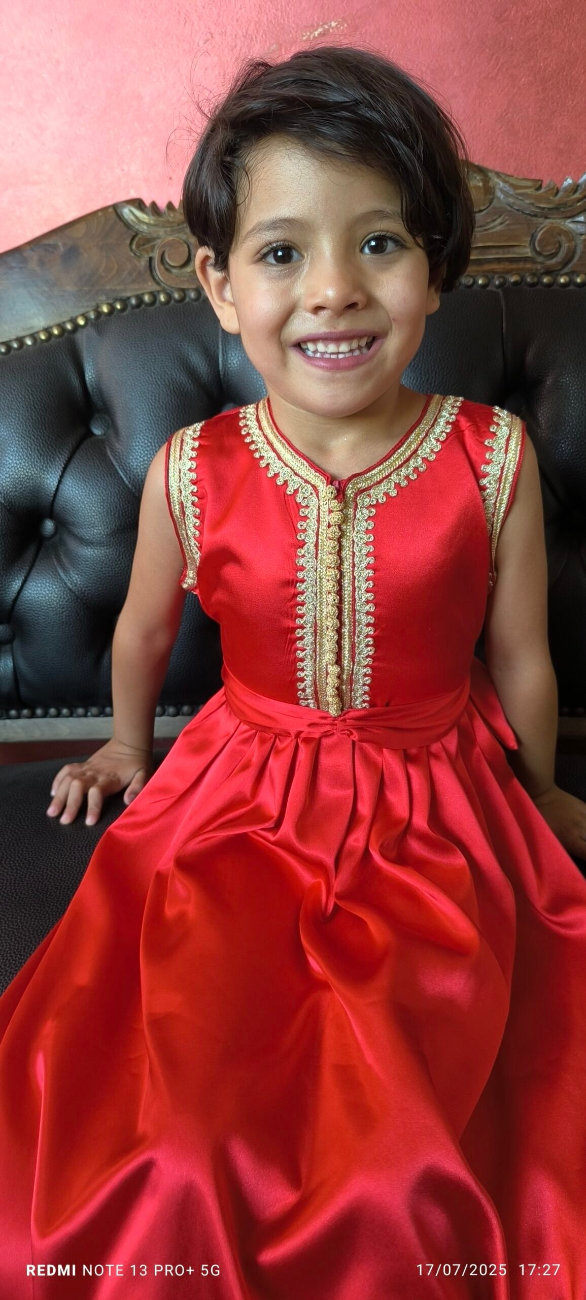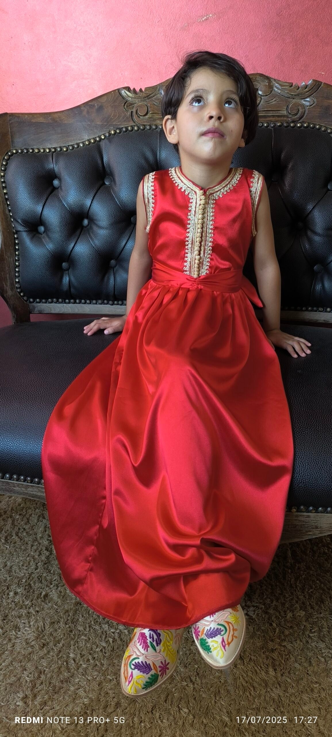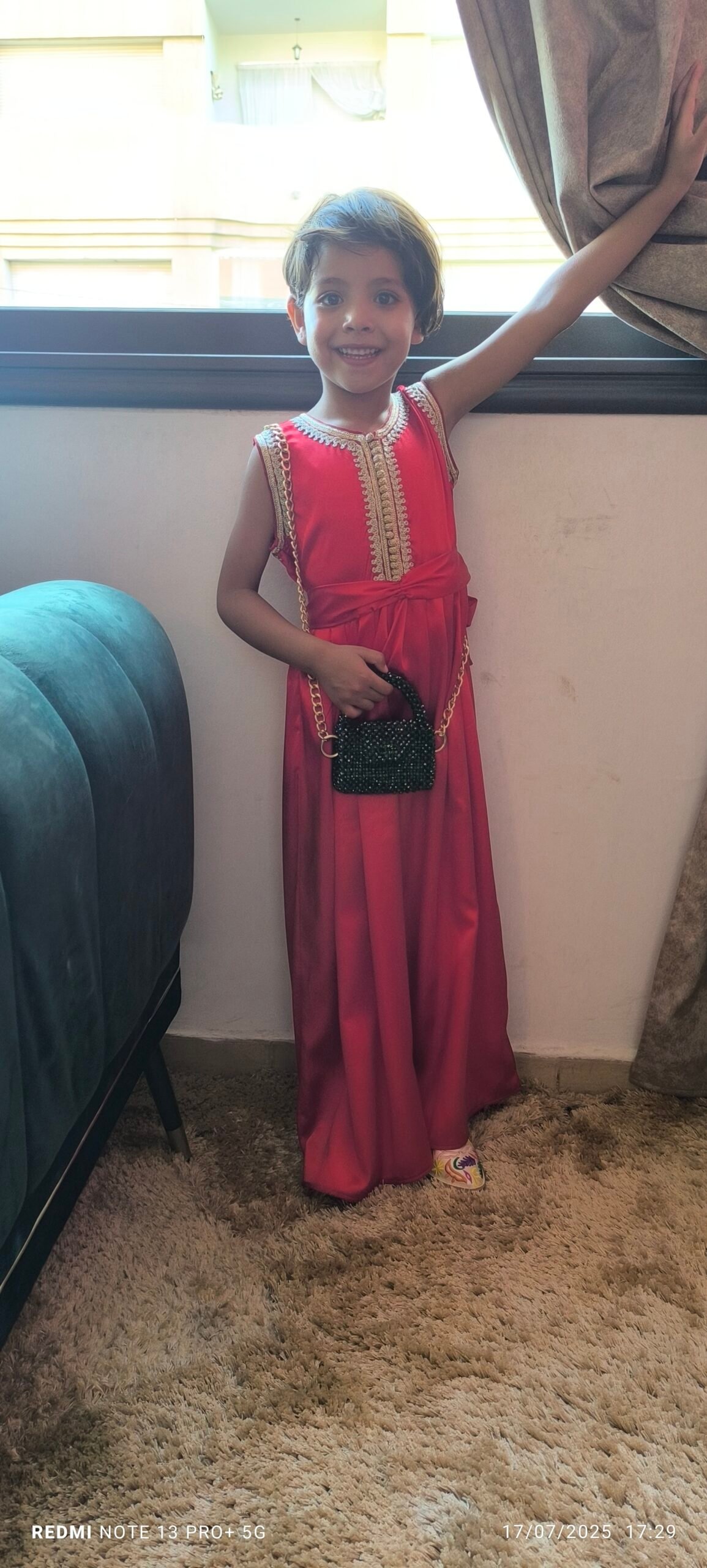 très belle robe faite à la main avec des manches qu’on pourrait enlever ou garder selon besoin. tissu crêpe et robe faite à la main avec des broderies marocaines fines. article unique pour une fillette de quatre à six ans.